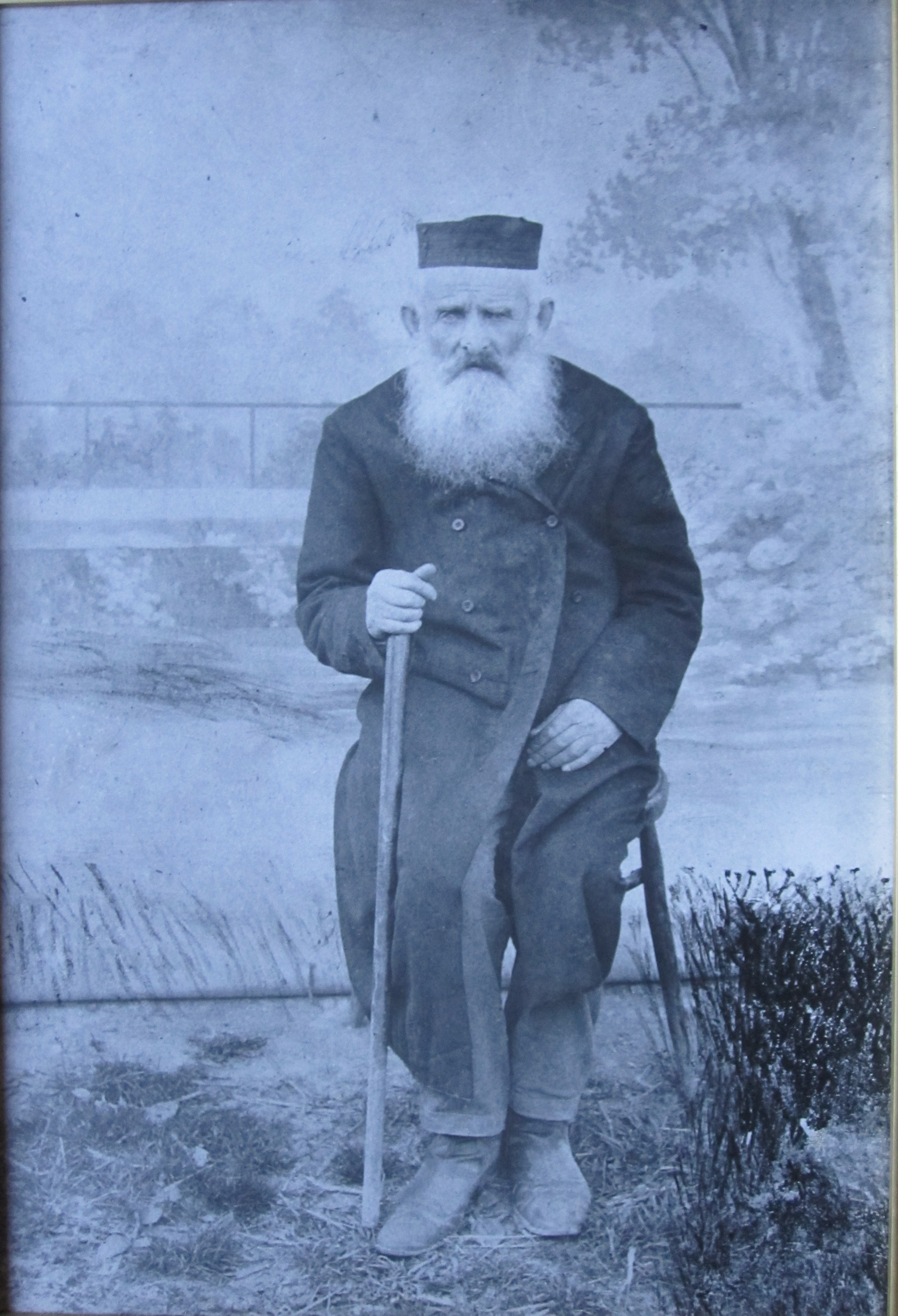 Posing for the camera Moshe Kramer, an elderly Jewish immigrant, posing as a farmer in an East End photographic studio