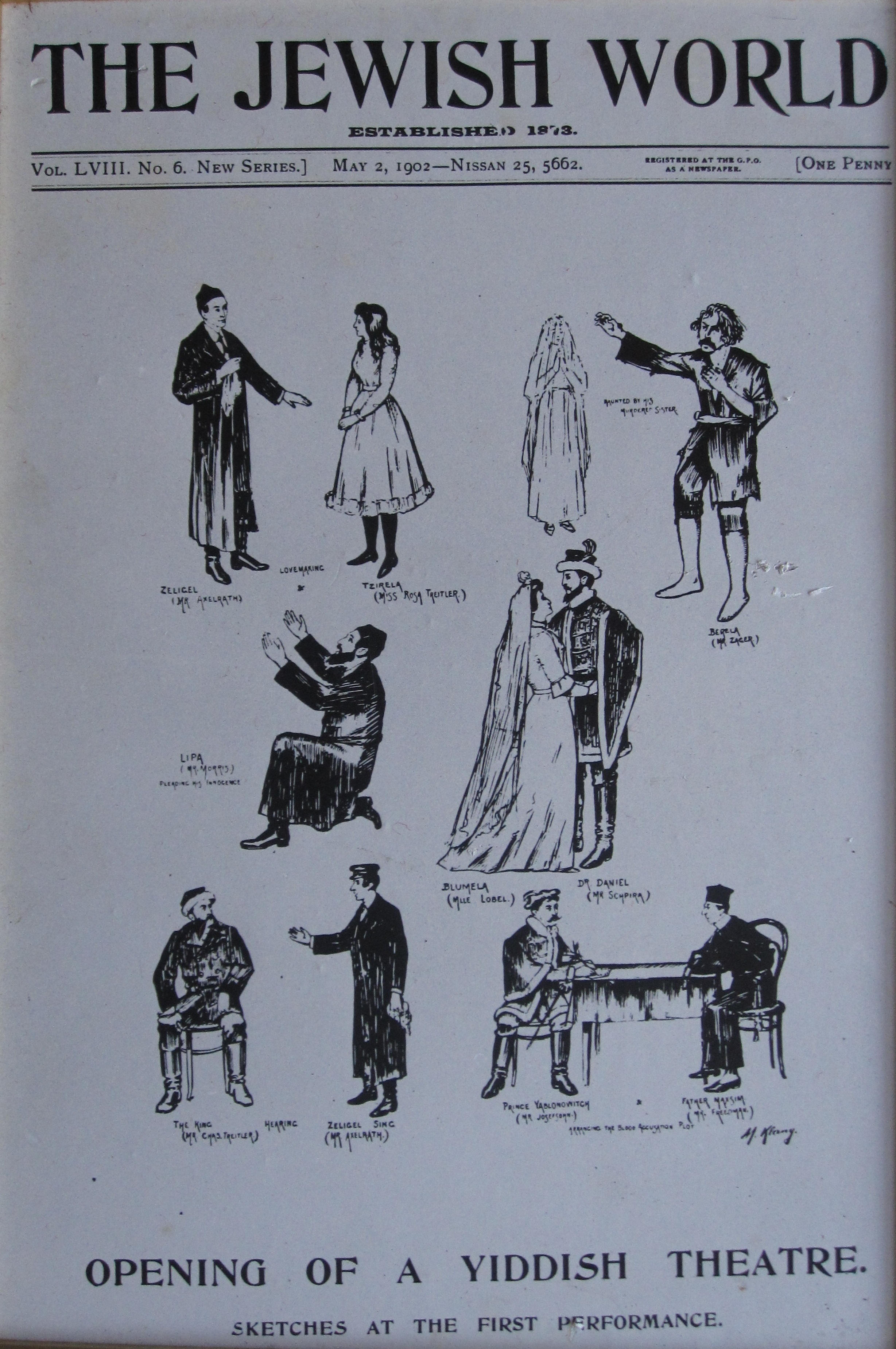 Celebrating a new theatreGallery: GalleryDescription: Front page of The Jewish World 2nd May 1902 celebrating the opening of a Yiddish theatre in the East End