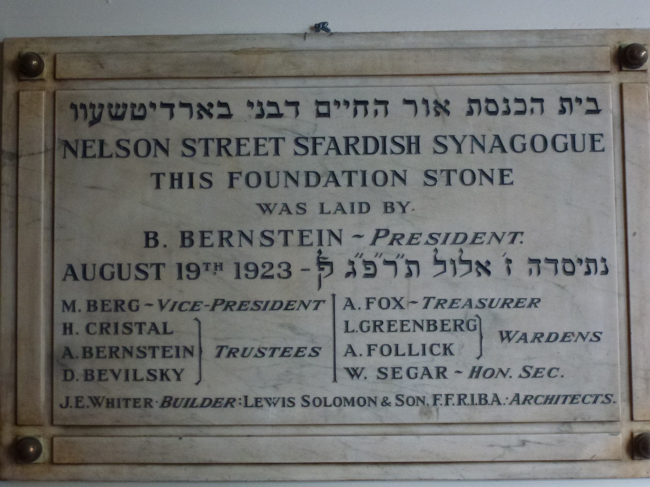 When I took my seat in this most beautiful and venerable of buildings I introduced myself to my neighbour, Andy Strowman. I asked him if he had any special memories of the Nelson Street community. He reminisced about Rabbi Szoszuah Szpetman, the Nelson Street rabbi of his youth some 60 years earlier. He remembered that when the rabbi gave his sermon the children rushed to leave the sanctuary as quickly as possible. The sermon was always in Yiddish and given from the box next to the ark. On their exit from the sanctuary the children would detour via the wardens’ box in front of the bimah. If the children had been good, chocolate would magically appear from the cupboard below the wardens’ seats and be handed to them. The shul’s shamash, a gentleman by the name of Manashah Pugachow, had a particularly ferocious reputation. If he heard you talking or otherwise misbehaving during the service he would give you a horrible scowl and bang loudly with his fist on his wooden bench, and if he really took a dislike to you, you were better off finding another shul! His brother was Max Dove and he was a warden of the shul. Max was married to the saintly Yiddie Dove, a lady who was a friend to all. Simchat Torah was an especially enjoyable time for the children. They would gather at the bimah and the women from the ladies guild in the upstairs gallery would throw them sweets.Sometimes the sweets would hit the children but this was considered a small price to pay for the prospect of filling your pockets with goodies. Andy’s great Aunt, Rachel Cohen, was an accomplished piano player who had the job of playing the piano at community simchas. In earlier times Rachel also played the piano at local cinemas providing background music to silent films. She specialised in playing along to Charlie Chaplin films. While Andy was speaking, former Board of Deputies president and Nelson Street member Henry Grunwald O.B.E. Q.C. sat down next to us. He was very particular about where he sat and explained that he was sitting in his father’s former seat.